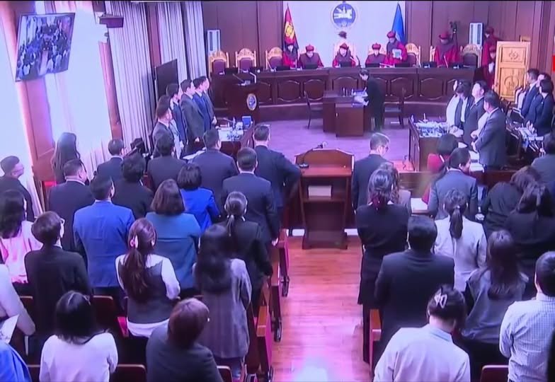 Их суудлын хуралдаанд Цэцийн есөн гишүүн бүрэн бүрэлдэхүүнээрээ оролцож, хуралдааныг Цэцийн дарга Г.Баясгалан даргалж байна. Нэхэмжлэгч буюу Монгол Улсын Ерөнхий сайд Г.Занданшатарыг төлөөлж ЗГХЭГ-ын дарга С.Бямбацогт, ЗГХЭГ-ын дэд дарга Д.Цолмон, ЗГХЭГ-ын Тэргүүн дэд дарга Д.Мөнх-Эрдэнэ, Ерөнхий сайд Г.Занданшатарын итгэмжлэгдсэн төлөөлөгч Н.Лүндэндорж оролцож байгаа бол гэрчээр УИХ-ын Тамгын газрын дарга Б.Баасандорж, шинжээчээр хуульч О.Машбат нар иржээ. Харин УИХ-ыг төлөөлж УИХ-ын гишүүн П.Сайнзориг, Х.Баасанжаргал, Г.Тэмүүлэн, А.Ундраа, Ц.Сандаг-Очир, Н.Номтойбаяр, М.Мандхай С.Ганбаатар Ч.Номин, Ц.Идэрбат, Б.Баярбаатар нар оролцож байна. Хуралдааны эхэнд маргагч талуудаас Цэцийн есөн гишүүнээс татгалзах үндэслэл байгаа, эсэх талаар тодруулахад УИХ-ын дэд дарга Х.Булгантуяа Цэцийн гишүүн О.Мөнхсайханаас татгалзах хүсэлтээ байгаагаа уншиж танилцуулсан.