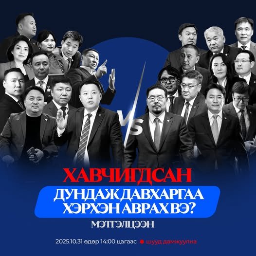 “ХАВЧИГДСАН ДУНДАЖ ДАВХАРГАА ХЭРХЭН АВРАХ ВЭ” сэдвээр сөрөг хүчин буюу УИХ дахь Ардчилсан намын бүлгийг төлөөлж бүлгийн дарга, Ардчилсан намын дарга О.Цогтгэрэл, УИХ-ын гишүүн Н.Алтанхуяг, О.Алтангэрэл, Ж.Баясгалан, Д.Жаргалсайхан,Ц.Мөнхтуяа, Г.Хосбаяр, Д.Цогтбаатар, С.Эрдэнэболд, Д.Энхтуяа нар Монгол Улсын Засгийн газрын Ерөнхий сайд болон Засгийн газрын гишүүдтэй мэтгэлцэнэ.