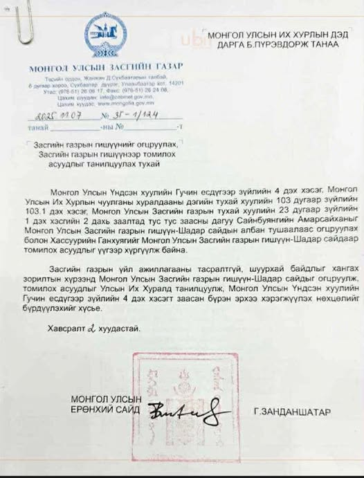 Монгол Улсын Ерөнхий сайд Г.Занданшатар УИХ-ын гишүүн, Төсвийн байнгын хорооны дарга Х.Ганхуягийг ШАДАР САЙДААР томилох албан бичгээ УИХ-д өчигдөр хүргүүлжээ.