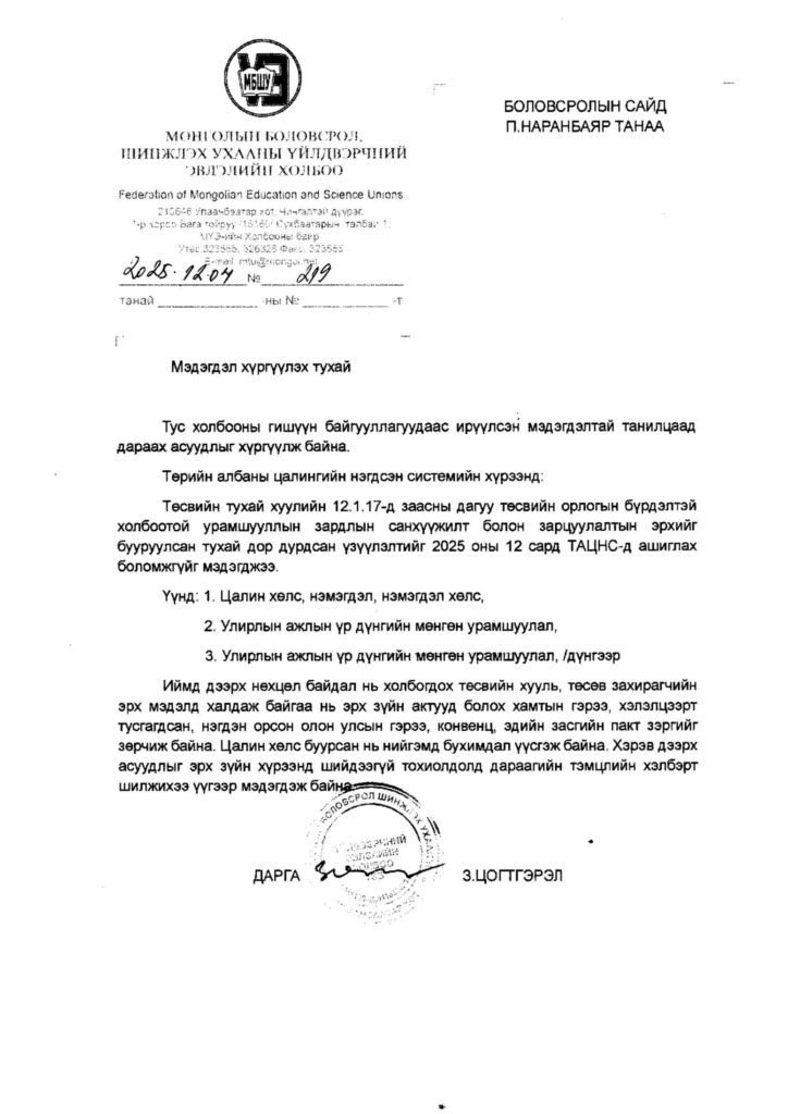 Цалин хөлсийг бууруулах, царцаах үйлдлийг нийт боловсролын салбарын багш ажилтнууд эсэргүүцэж байгаа тул яаралтай асуудлыг нааштайгаар шийдэхийг Монгол Улсын Сангийн яам – Ministry of Finance Mongolia аас шаардаж байна” гэжээ.