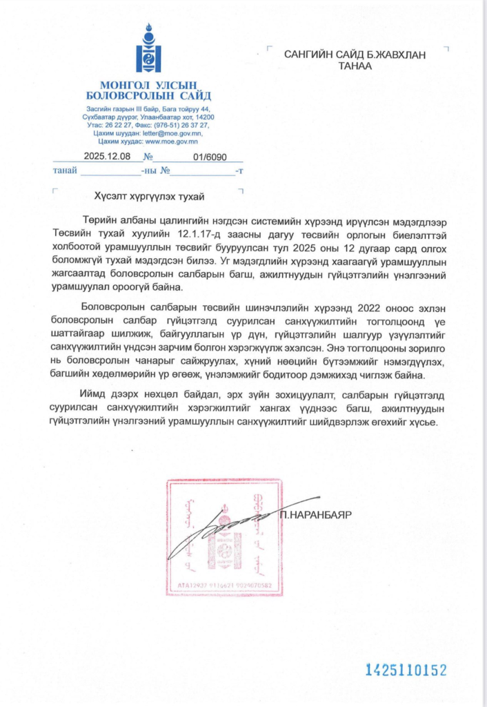 Энэ талаар Боловсролын яамнаас тодруулга, мэдэгдэл хүссэн. Боловсролын яам сангийн яаманд хүсэлтийг хүргүүлсэн байна.