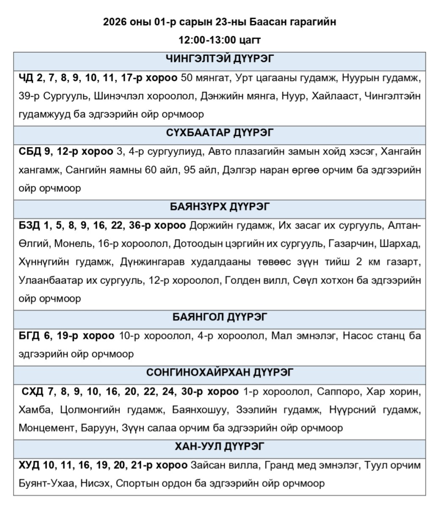 Эрчим хүчний чадлын дутагдлаас шалтгаалан 2026 оны 01-р сарын 23-ны Баасан гарагт цахилгаан эрчим хүчний “ХЯЗГААРЛАЛТ ХИЙЖ БОЛЗОШГҮЙ” байршлуудын хуваарь