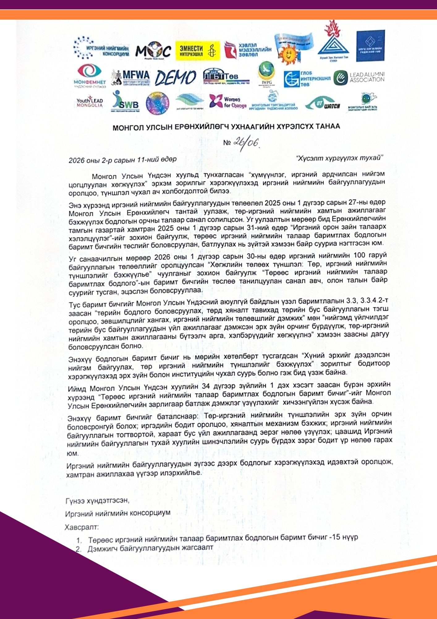 “Хөгжлийн төлөөх түншлэл: Төр-Иргэний нийгмийн түншлэлийг бэхжүүлье” иргэний нийгмийн чуулганы мөрөөр чуулганд оролцсон иргэний нийгмийн байгууллагуудын нийт 3000 орчим гишүүнчлэл бүхий 20 гаруй байгууллага, судлаачдын төлөөлөл “Төрөөс иргэний нийгмийн талаар баримтлах бодлого”-ын баримт бичгийг батлуулах албан хүсэлтийг Монгол Улсын Ерөнхийлөгч Ухнаагийн Хүрэлсүх-д хандан 2026.02.10-ны өдөр хүргүүлжээ.