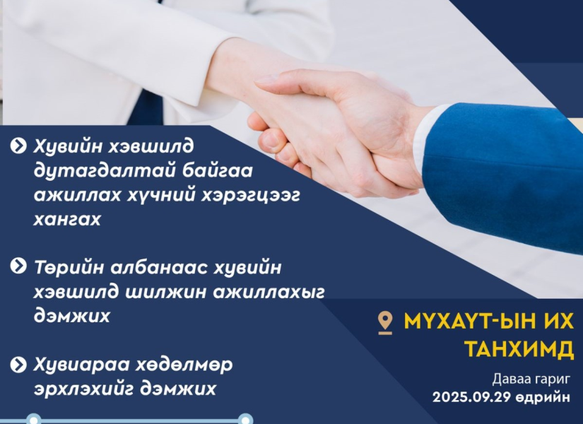 ГБХНХЯ, Хөдөлмөр, халамжийн үйлчилгээний ерөнхий газар, МҮХАҮТ хамтраад “Хувийн хэвшилд дутагдалтай байгаа ажиллах хүчний хэрэгцээ хангах” өдөрлөгийг энэ сарын 29-нд зохион байгуулна.