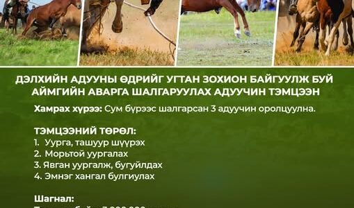Тулгар төрийн 2234, Их Монгол улс байгуулагдсаны 819, Үндэсний эрх чөлөө, тусгаар тогтнолоо сэргээн мандуулсны 114, Ардын хувьсгалын 104 жилийн ойн Үндэсний их баяр наадмын үндэсний бөхийн бүртгэл эхэллээ. Энэ жилийн наадамд улс, аймаг, цэрэг, сумын цолтой болон залуу 512…